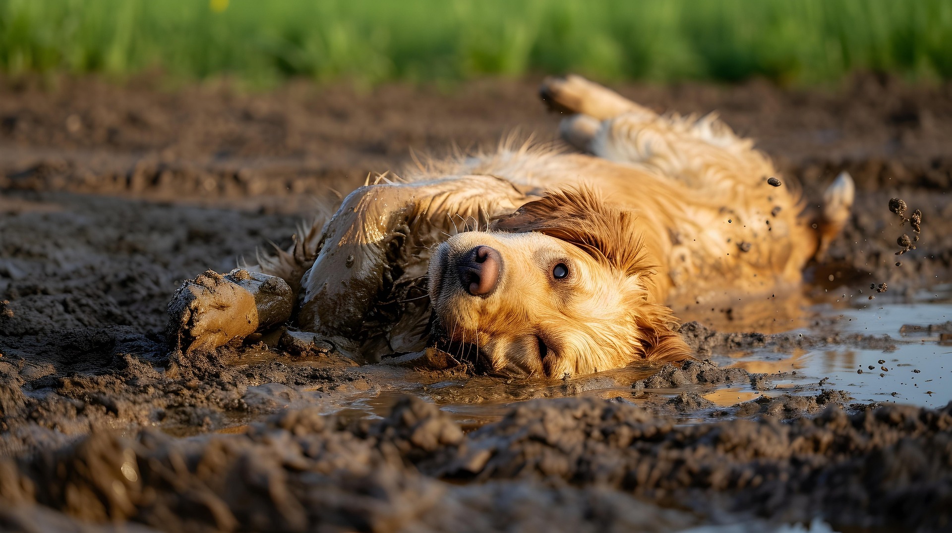 pies, który się wytarzał w błocie, piachu itp. - zwykle wystarczy tylko spłukać wodą